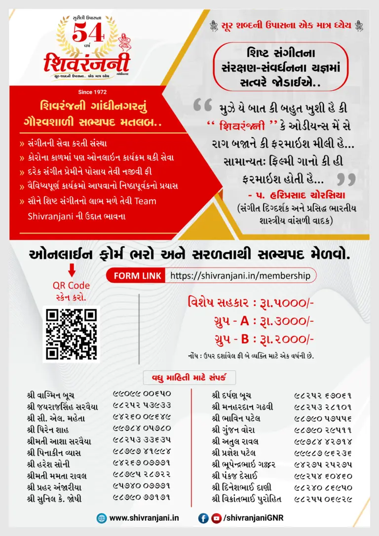 “Shivranjani” is a mission started with the sole purpose of promoting the talent in music and performing arts of Gujarat. Our membership fees have been chalked out at a nominal price such that every music lover can avail our services and programs.